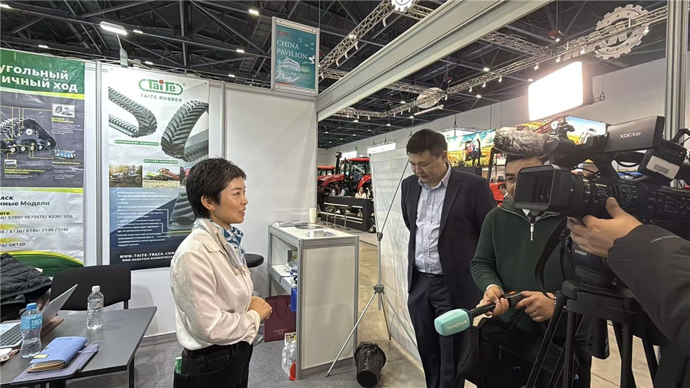 2025 年 10 月 22 日,哈萨克斯坦农业博览会盛大开幕,全球多国主流企业齐聚展会现场,集中展示农业领域的前沿技术与创新产品,为推动区域农业发展搭建起高效交流平台。在这场聚焦农业现代化的行业盛会中,泰特橡胶凭借在橡胶履带领域的专业积淀,有幸受邀接受哈萨克斯坦国际电视台的采访,向当地及周边区域观众深度解读橡胶履带技术对农业生产的核心价值。